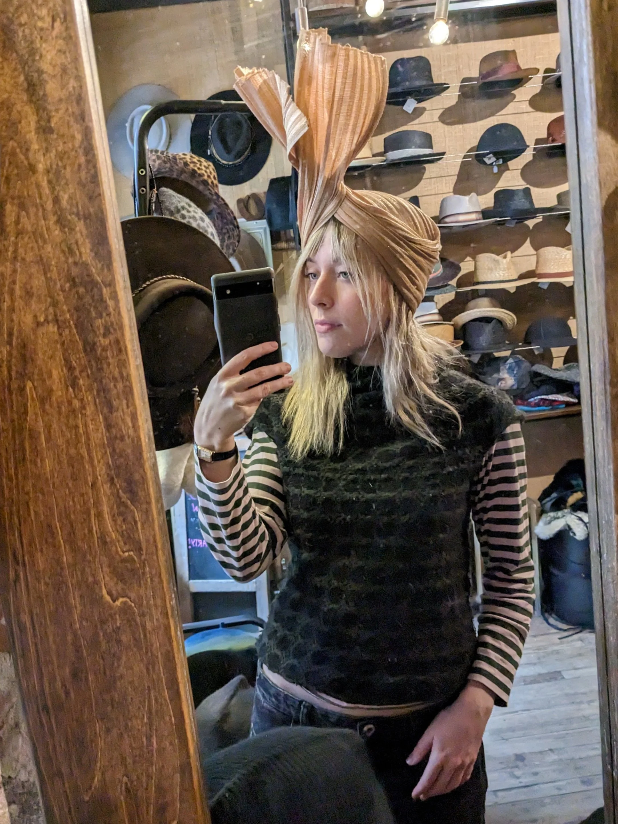 It’s intimidating at times to think that anything can be a hat / hat can be anything, which is unlike clothes, which are more circumscribed or so it seems to me by needing for example to be made of fabric and fit on a human body. Which sometimes looking at certain hats, and the vast range of materials that make a hat, does not seem to be in the same realm. I guess that’s freeing. It’s really different from the clothes I admire in which the hardest work may be largely invisible but is still more obvious than the making or sculpting of a hat. Even the Balenciaga origami-esque coat I’m slogging through or any mysterious Miyake pattern I’ve sewn seems more conventional than even the most “regular” little turban I just made in a weekend.
